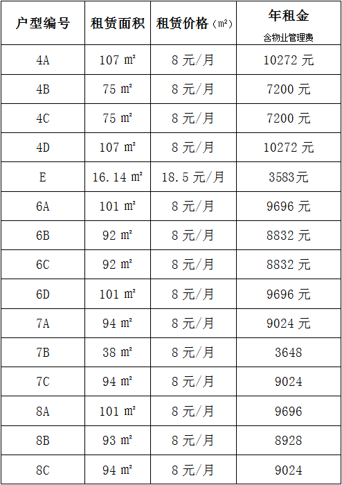 本次所有房屋均為現狀招租,意向承租戶(hù)自行現場(chǎng)踏勘。除E標外,其余只能作為居住、辦公等兩種用途,意向承租人按招商價(jià)格同物業(yè)公司洽談,洽談成功之后簽訂租賃合同,先到先得,租完為止。