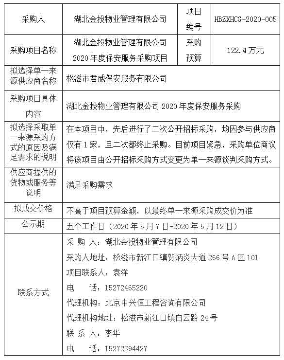 湖北金投物業(yè)管理有限公司2020年度保安服務(wù)采購《擬采用單一來(lái)源采購方式公告》