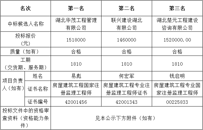 金投?新城臻品建設項目監理金投?新城臻品建設項目監理于2023年02月28日在湖北省電子招投標交易平臺發(fā)布招標公告,2023年03月30日在松滋市開(kāi)標室(1)開(kāi)標,并于2023年03月30日完成評標工作。根據評標委員會(huì )提交的評標報告,湖北松滋金投置業(yè)有限公司已經(jīng)確認評標結果,現進(jìn)行評標結果公示。