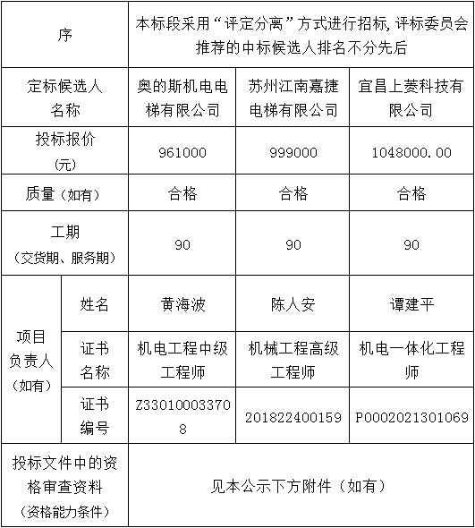 金投?彩虹灣一期(S1號樓綜合商業(yè))及配套工程金投?彩虹灣(一期S1#樓綜合商業(yè))電梯采購及安裝項目于2023年11月14日在湖北省電子招投標交易平臺發(fā)布招標公告,2023年12月11日在松滋市開(kāi)標室(2)開(kāi)標,并于2023年12月11日完成評標工作。根據評標委員會(huì )提交的評標報告,湖北松滋金投置業(yè)有限公司已經(jīng)確認評標結果,現進(jìn)行評標結果公示。