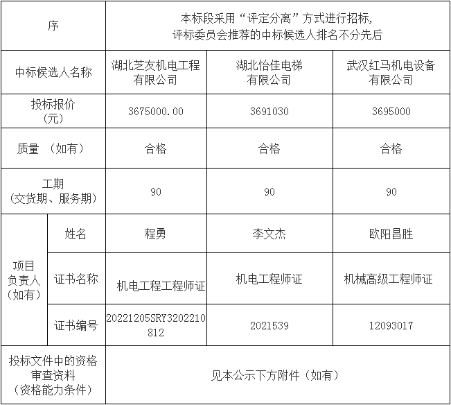 金投?新城臻品金投?新城臻品建設項目電梯設備采購安裝項目于2024年01月10日在湖北省電子招投標交易平臺發(fā)布招標公告,2024年01月31日在松滋市開(kāi)標室(2)開(kāi)標,并于2024年01月31日完成評標工作。根據評標委員會(huì )提交的評標報告,湖北松滋金投置業(yè)有限公司已經(jīng)確認評標結果,現進(jìn)行評標結果公示。
