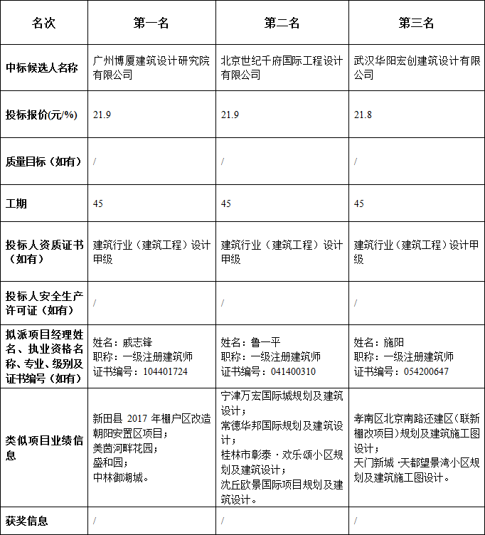 松滋市金投•劃子嘴幸福家園安置小區及配套設施建設項目設計于2018年11月24日在湖北公共資源交易信息網(wǎng)發(fā)布招標公告,2018年12月24日在松滋市公共資源交易中心開(kāi)標。根據評標委員會(huì )提交的報告,松滋市金投•劃子嘴幸福家園安置小區及配套設施建設項目設計已經(jīng)確認開(kāi)標結果,現進(jìn)行中標候選人公示。