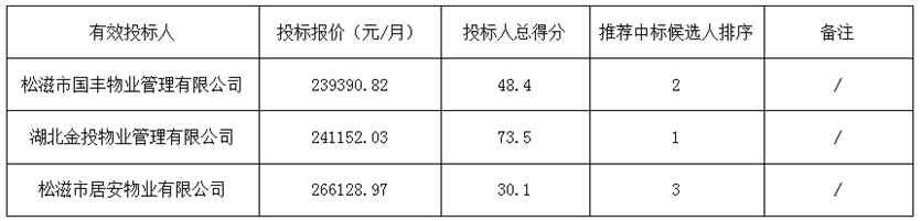 金松•尚含綠城前期物業(yè)服務(wù)項目于2019年08月04日在松滋新聞網(wǎng)(網(wǎng)址:http://www.songzinews.net)(媒介名稱(chēng))上發(fā)布招標公告,2019年09月11日在松滋市樂(lè )鄉凱瑞大酒店五樓會(huì )議室開(kāi)標,并于2019年09月11日完成評標工作。根據評標委員會(huì )提交的評標報告,湖北松滋金投置業(yè)有限公司已經(jīng)確認評標結果,現進(jìn)行評標結果公示。